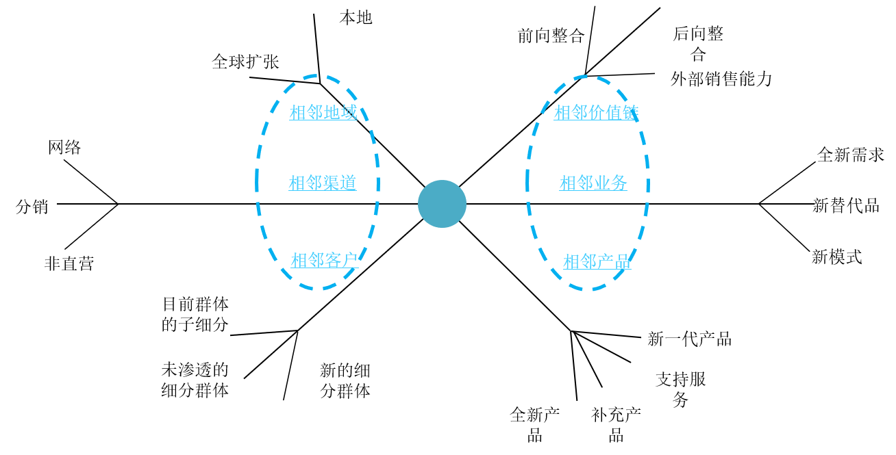 “相邻市场”含义深刻,包括相邻的价值链、相邻的业务、相邻的产品、相邻的地域、相邻的渠道、相邻的客户等。咨询公司给客户做业务选择的时候,经常建议客户从产品延伸到服务(即“从产品提供商”到“解决方案提供商”,或者是从“设备商”到“服务商”等),背后的原理就是“相邻增长”,这是一种被验证过的成长模式。