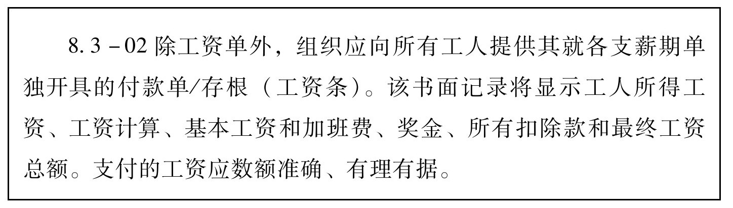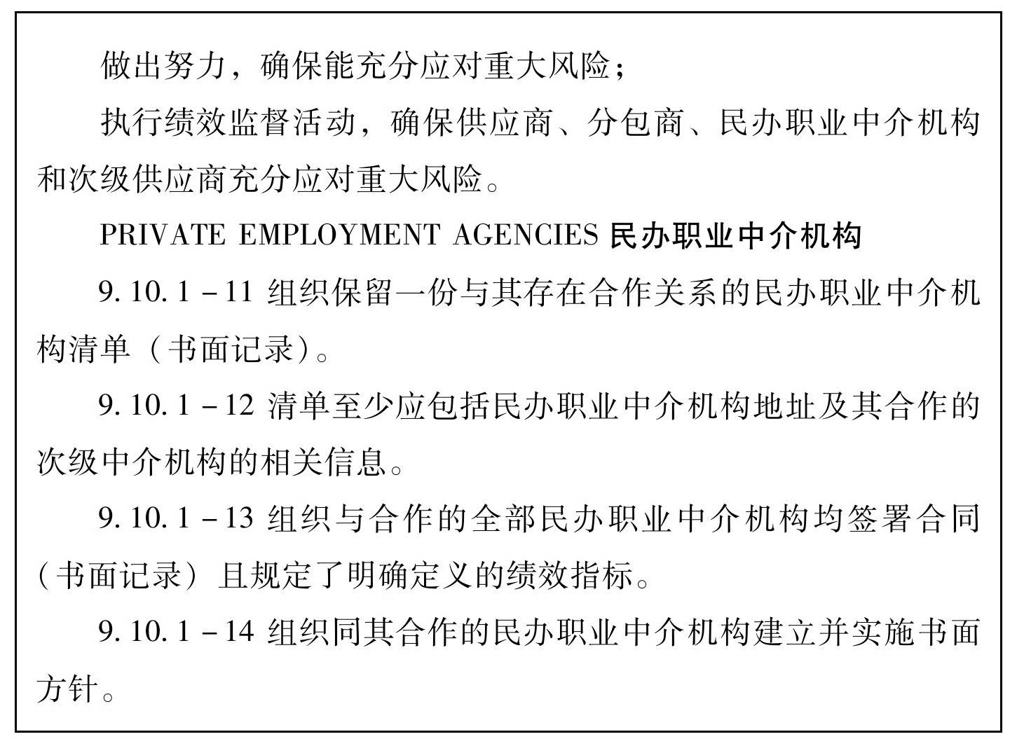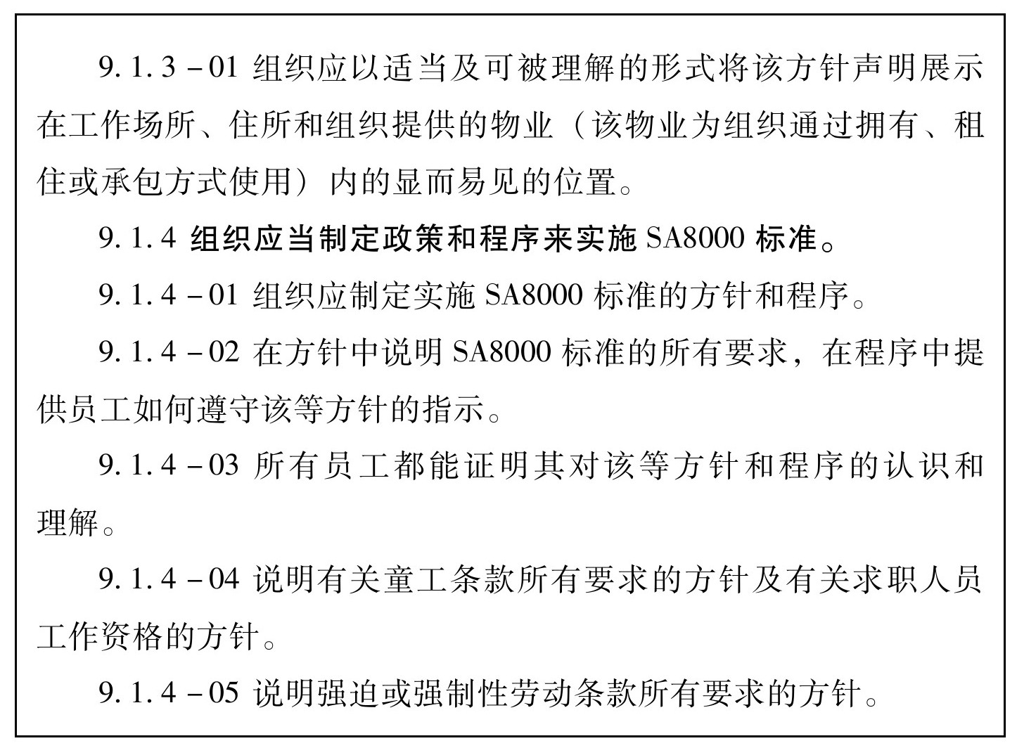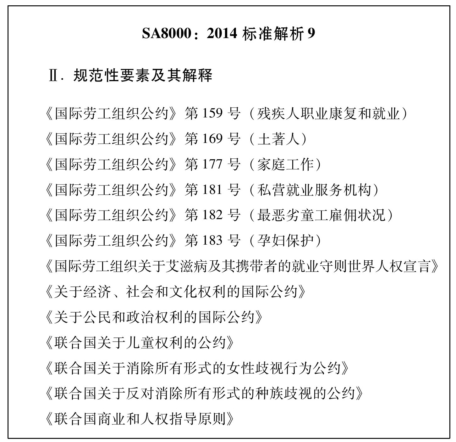 4.本标准目的在于提供一个基于联合国人权宣言,国际劳工组织(ILO)和其他国际人权惯例,劳动定额标准以及国家法律的标准,授权并保护所有在公司控制和影响范围内的生产或服务人员,包括公司自己及其供应商、分包商、分包方雇用的员工和家庭工人。