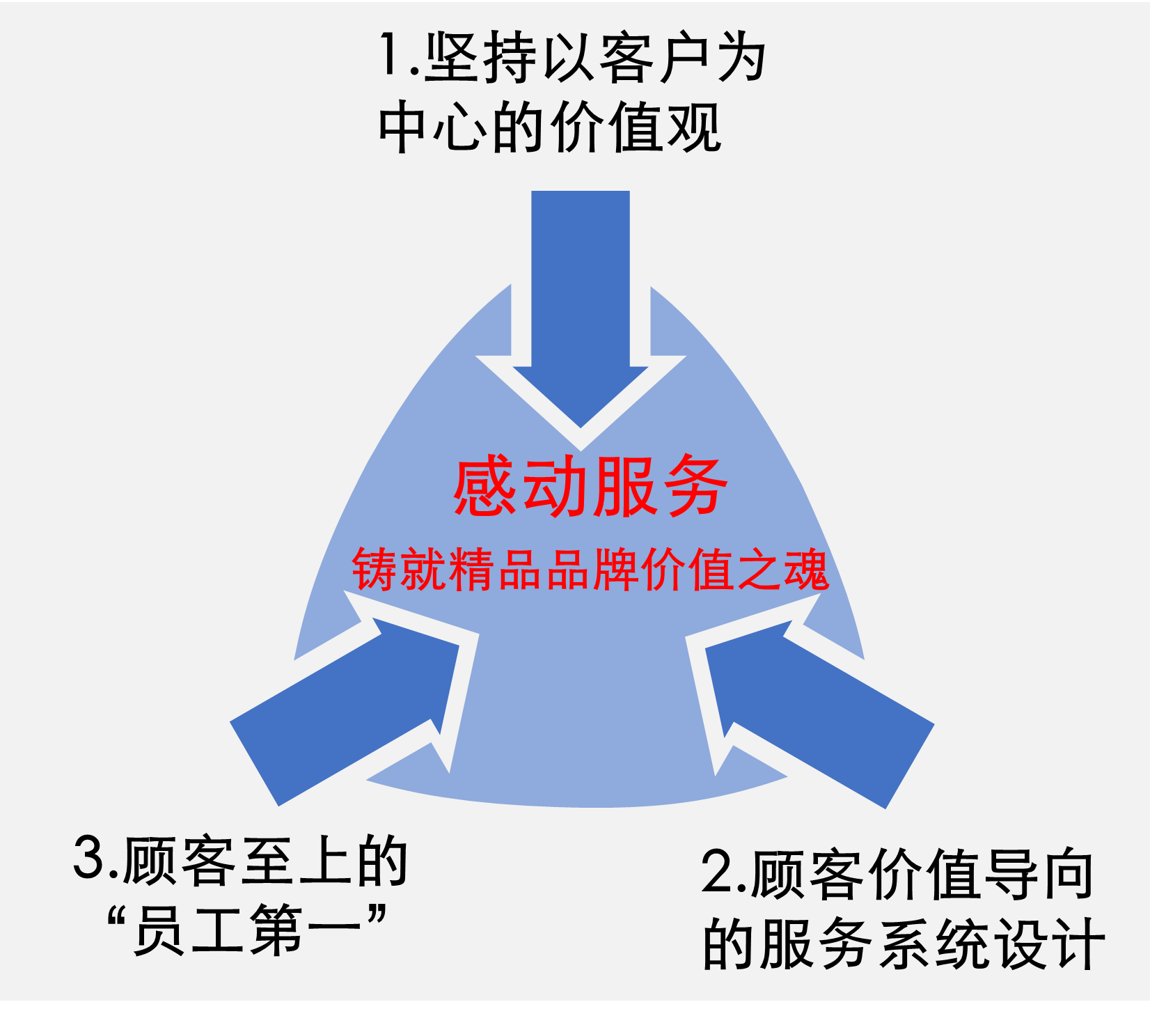 感动服务是精品品牌营销价值构成体系的灵魂,而价值观、制度与员工是打造感动服务的“铁三角”,即企业在以顾客为中心的价值观指引下,通过构建合理有效的服务系统设计的制度,彻底贯彻“客户为上,员工第一”的理念,积极授权予公司的员工,释放员工的服务创造力,用“心”为顾客创造性地提供服务,持续超越顾客的价值预期,感动顾客,培育信赖与忠诚的顾客关系。