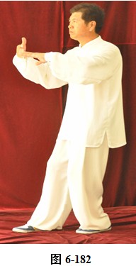 掤:右腰上提,右脚向前迈步,重心渐渐移至中间,成右弓步; 腰继续上提,右小臂同时向右上前方打掤,右掤手高与膻中穴平。左手掌心向下置于左胯旁,意念领腰继续上提,右手随之向右上撩掤,左掌跟随向上,当掤至略高于肩时,两掌翻转掌心斜相对(见图6-174至6-189)。