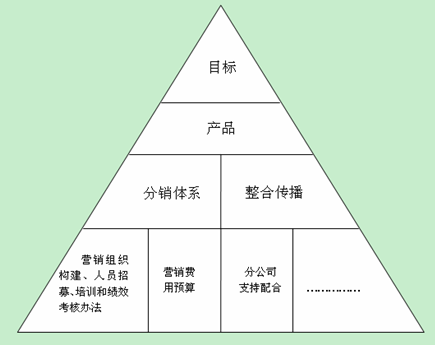 整个咨询服务过程都是为了达成一个目标,这个目标是由客户提出,并经过我们论证是可行的。为了达到这个目标,必须要有一组好的产品来支撑,项目组通过对行业发展趋势地预测和竞争产品地研究,确定一个适合德农的产品组合。产品必须到达最终消费者手中才能实现其价值,这就需要建立一套快速、有效的分销体系,把产品“推”到消费者面前,同时通过一系列的创新整合传播方法,把消费者与产品的距离“拉”近。为了更好地实现方案的“落地性”,我们把人、财、物的分配和整合具体化,从而使这个新产品业务能有条不紊地快速运作。