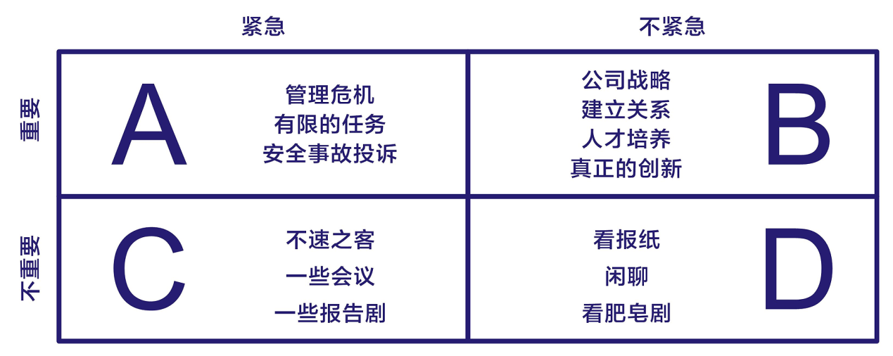 A类事件紧急又重要,如有限期的计划、管理危机、安全事故、客户投诉等;B类事件不紧急但很重要,如公司战略形成、建立新型的人际关系、企业人才培养、学习新技能、保持身体健康等;C类事件不重要但很紧急,如接待不速之客、接电话、出席一些会议、写一些报告等;D类事件既不紧急又不重要,如看报纸、看电视连续剧、闲聊等。