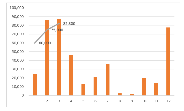 某公司过去12个的销售数据如下,虽然并没有验证分析,不过存在很大的可能性是该数据分布并不服从正态,并通过这个12个数据得出了月均销售和其标准差。