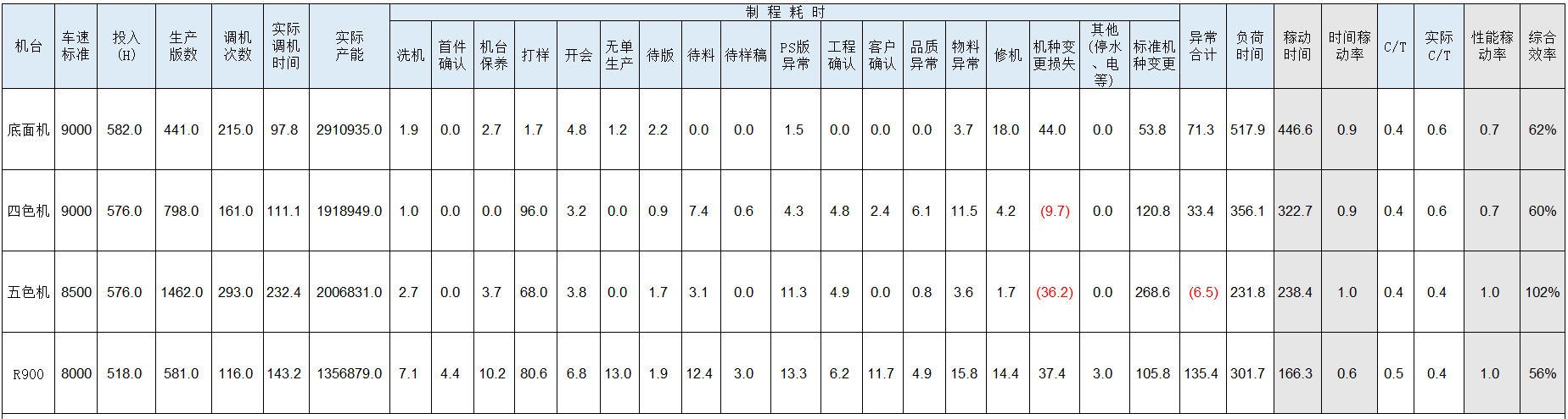 异常合计:洗机、首件确认、待版、待料、待样稿、PS版异常、工程确认、客户确认、品质异常、物料异常、修机、机种变更损失、其他(停水、电等)、标准机种变更。
