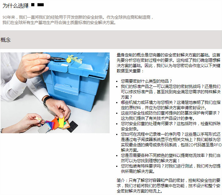 图5-3则是另一种方式。这是一家做安全封条的公司,在“为什么选择我们”栏目中关于定制优势的部分介绍内容。虽然并不是在直接推销某款产品,也没有鼓吹公司的什么优势,但看他们向客户问出的一系列问题,每个问题都体现出他们的专业、严谨、经验丰富、熟知客户痛点和需求,字字句句都是毋庸置疑的实力。