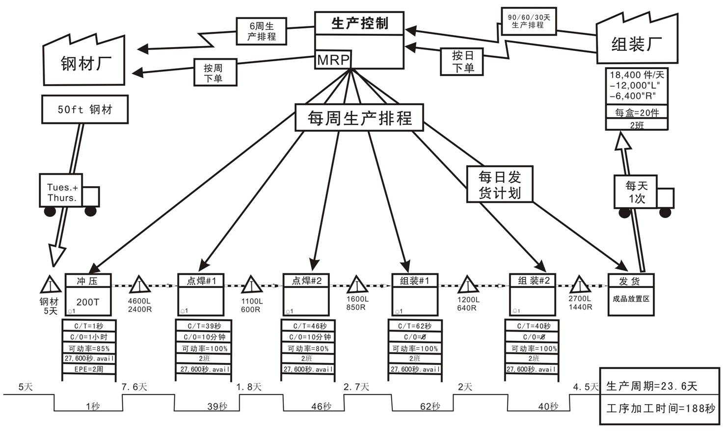 价值流图这个工具起源于日本丰田,最初是对企业内部的计划与物料供应进行分析,后面分解到企业的整体交付流程。绘制企业层面的价值流图,分析影响交期的原因,包含当前预测模式、订单接收、主计划、车间计划、采购计划环节。可以将制造价值流图称为“车间级价值流图”,包含计划和采购内容的价值流图称为“公司级价值流图”。