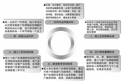 要体现“以客户为中心”的经营理念,就要形成“一线为客户服务、二线为一线服务”的经营管理格局,即形成全行以客户为中心,各个部门以客户部门为中心,为客户部门提供各种后台支援的业务发展体系,以此改变各个部门相互扯皮的现象,形成相互协调、整体联动的机制。在这个机制形成过程中,客户经理起着协调行内部门,凝聚内部合力的纽带作用。