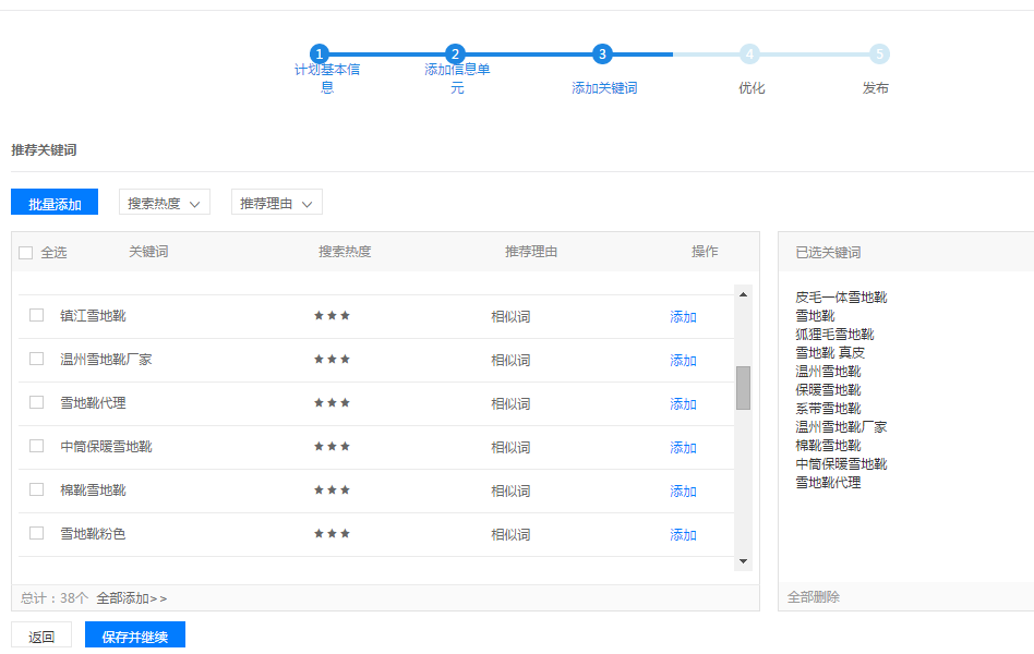 系统会自动匹配关键词,但是也不精准,所以建议在右边输入精准关键词,这样匹配度比较高,效果也比较好。我们看到输入关键词之后系统匹配的关键词,就可以进行合适的选择,选完之后保存并继续。备注:选择三颗星的热度高的词。