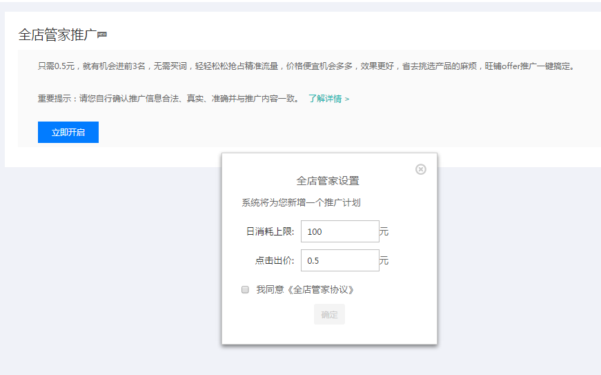 全店管家是另外一个智能化的推广模式,自己可以设置。设置每天的日消耗上限100元(依据行业而定),设置点击出价(可以依据系统来,也可以自己设置)。设置完之后点击确定就可以,系统就开始帮你全区域间断推广。到了设定金额就会自动暂停。