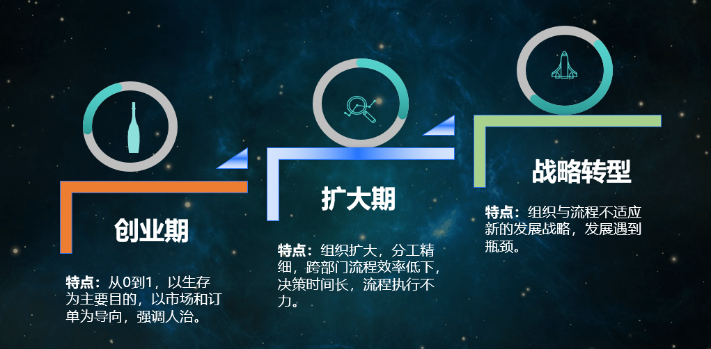 那是不是其他发展阶段的企业就不可以导入流程治理体系呢?当然不是,任何时期的企业只要有能力、有资源、有意愿,都可以导入流程治理体系,只是不同时期导入流程治理体系,付出的代价和发挥的作用不一样罢了。