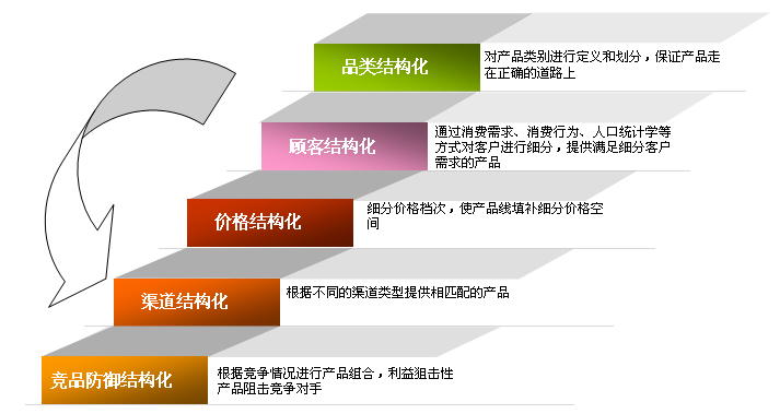 产品结构化是指企业按照以下优先顺序对产品组合作出决策:品类结构化、顾客结构化、价格结构化、渠道结构化、竞品防御结构化。