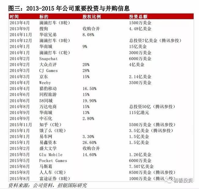 表6-43 腾讯2013—2015年重要投资与并购信息