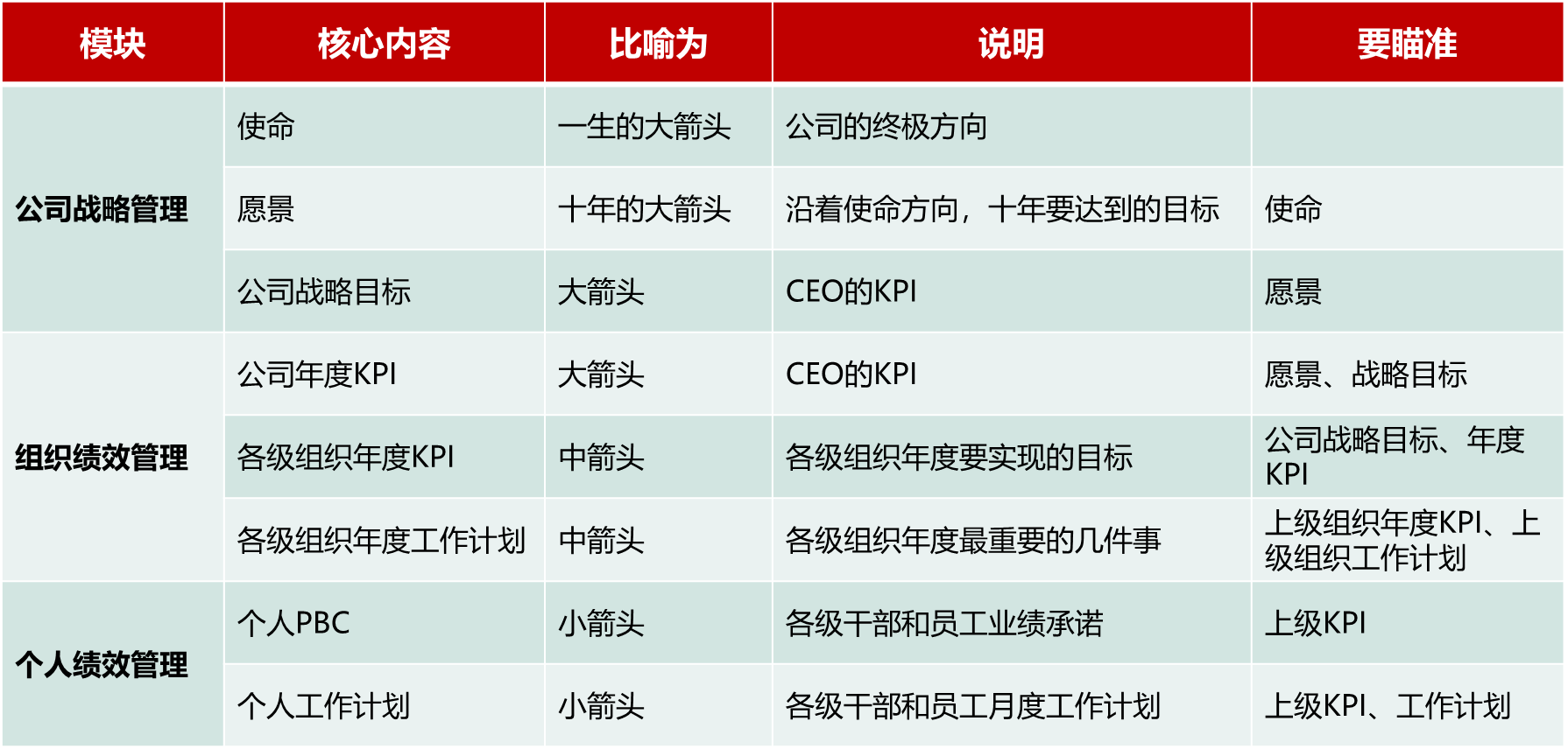 从使命推导出愿景,从愿景分解出战略目标,再有战略目标分解出年度目标、组织绩效和个人绩效,进而影响组织成员的日常行为,而组织成员的日常行为又反过来影响愿景能否实现。如表4-3所示。