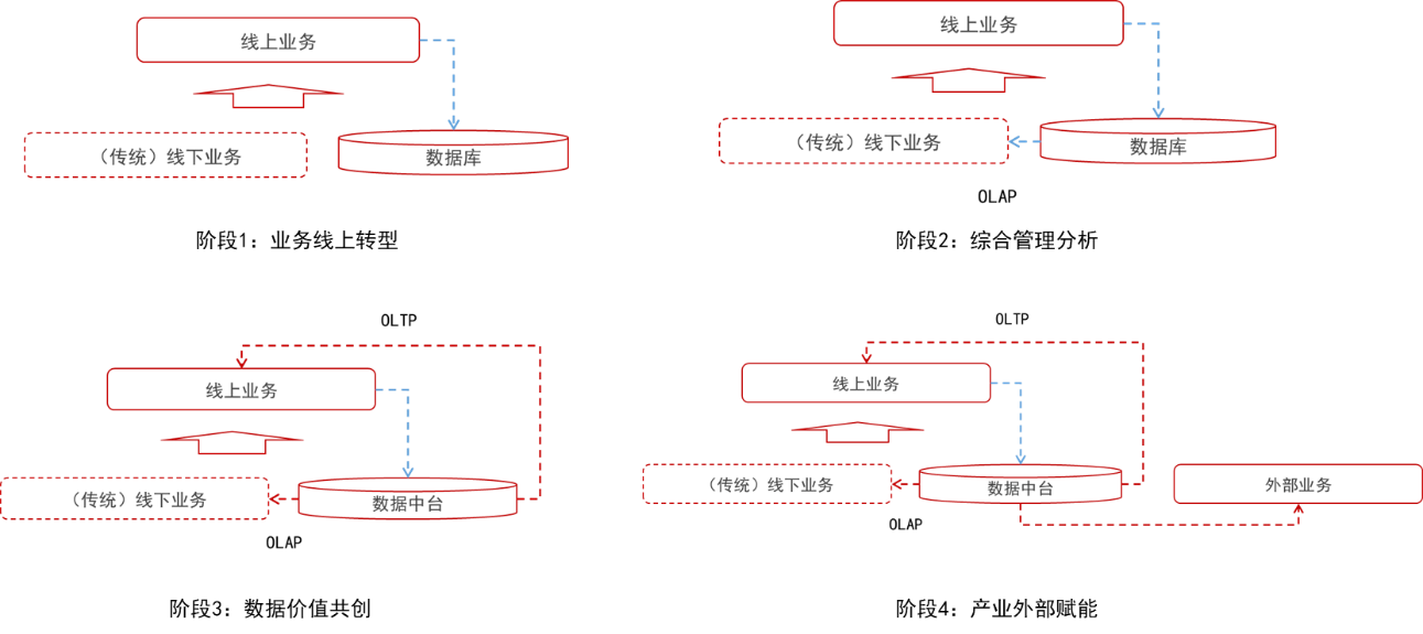 企业进行数字化转型是一个长期持续的发展过程,随着企业对数据以及数据创新的重视程度和认知水平不断提升,企业的数据管理水平和数据应用水平也在不断深化,逐渐发展出更高级的数字化业务形态。企业数字化转型的发展阶段有很多划分方法,本书则建议将其划分为业务线上转型、综合管理分析、数据价值共创、产业外部赋能等几个阶段分别进行详细介绍。