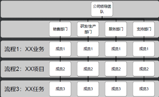 参考以下横向打通职能组织的示意图,以流程、项目、业务为主线横向贯通各职能部门,所构成的矩阵组织,可以理解为流程型组织。