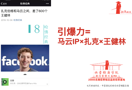 我们再看一个案例,同样的道理,我们把facebook的创始人扎克伯格和马云、王健林联系在一起。扎克伯格和马云之间差的600个王健林,啥意思?除了财富差距,还有什么差距,居然能差那么多?这一下子就引发了很多人的兴趣。这里面利用了三个IP——马云、扎克伯格、王健林。