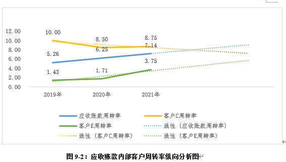 纵向分析则关注企业内部客户间的应收账款周转率情况。通过此分析,企业能够识别出哪些客户的应收账款周转率存在问题,进而采用客户信用管理策略进行干预。如图9-2所示,客户C的应收账款周转趋势线位于企业应收账款周转率的上方,表明其处于正常状态;而客户E的应收账款周转率趋势线则位于下方,表明其存在问题。因此,企业应将客户E纳入信用评估体系,并在未来的交易中根据其信用状况进行合同签订,以规避坏账风险。