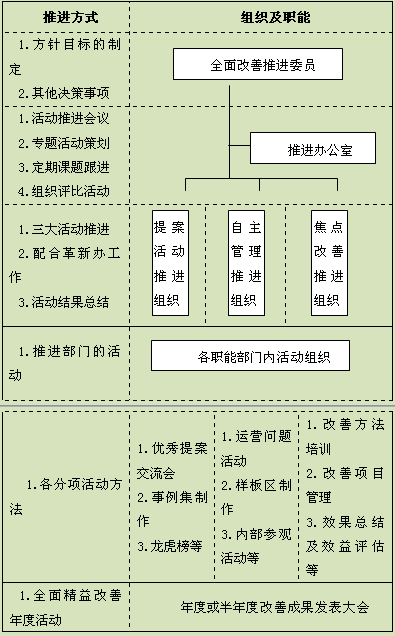 (1)推进委员会由企业的高层组成,主要应该包括公司的最高负责人(董事长或总经理)和各部门负责人,董事长或总经理一般就是推进委员会的主任或委员长。推进委员会主要负责活动方针的制定、年度改善大会的召集及对推进事务局提出的重要推进事项的审议和决策。