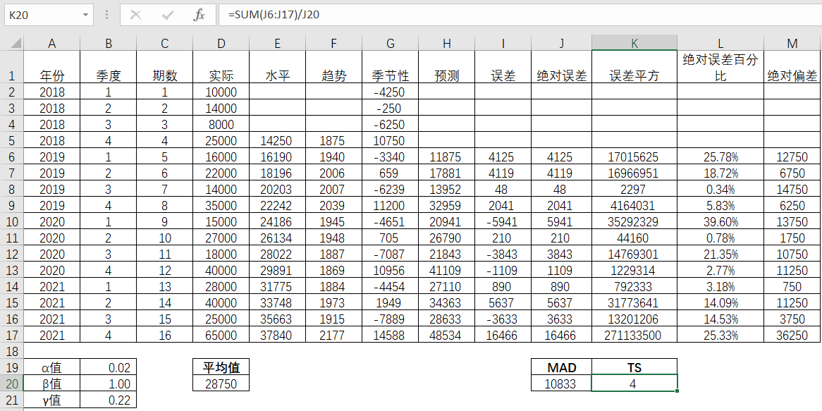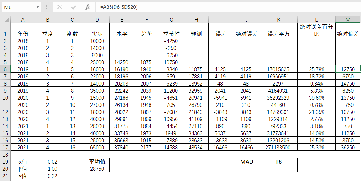 最后有了各期的实际值和预测值之差的绝对值,以及MAD,那么TS就可以通过公式计算出来了。TS为4,属于可接受范围内。这个正值为4的信号表示,实际需求大于预测值。反之,若是结果为负,则表明预测值大于实际值。