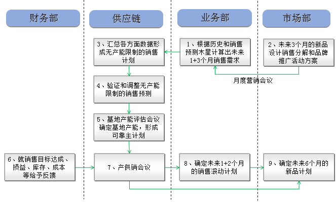 利用上述内容汇总出来的资料作为产供销会议的重点资料,有针对性地再对未来1个月和滚动2个月的销售预测做回顾确认。对现有的库存情况让业务提供一个销售策略;对工厂(无论是生产出来的还是销售退货造成的)的呆滞品进行分析并确认处理方案和时间;对销售想开拓的新产品及其市场动向进行生产计划分析和产能评估;对于按销售计划所核算的原料采购计划和库存进行确认,让财务部核算库存成本;对于整个销售计划及库存进行成本核算,评估利润效益。