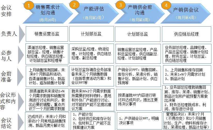 产供销会议作为一个平衡生产与销售的信息沟通平台,参会人员必须是跟生产、销售有关并且是能做决定的人。因为这个平台的信息是用于计划生产什么、生产多少、销售什么、销售多少、库存的处理情况、销售趋势是怎样的,只有这些信息明确了,生产和销售才能对接得更好。所以,产供销会议应该的参与人员必须包含:销售部相关产品线销售负责人、采购负责人、计划部负责人、物流部负责人、制造供应链负责人和财务部负责人。其他人员按会议的工作需求由企业自身安排。