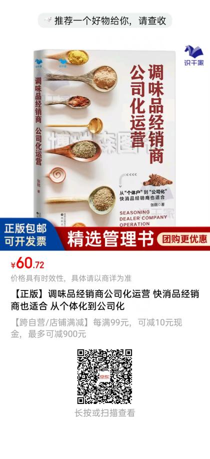 出版有专著《调味品企业八大必胜法则》《调味品经销商公司化运营》《重塑