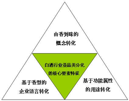 通过研究,我们总结得出白酒行业亚品类分化的核心要素特征是它们在品类营销应用过程中有改变,但是没有本质的变化。白酒亚品类营销应用核心要素特征:一是由香到味的概念转化;二是基于香型的企业语言转化;三是基于功能属性的用途转化。如图1-2所示。