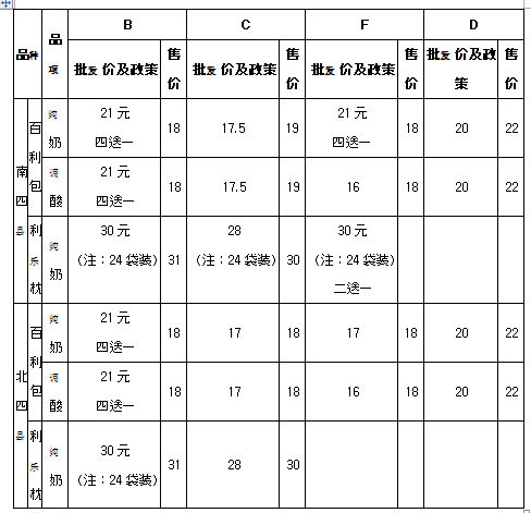 (2)果味酸奶目前执行“七送一”政策,按目前经销商普遍发货价16元计算,毛利空间3元/件,这也是对特级纯牛奶推广积极性不高的原因。