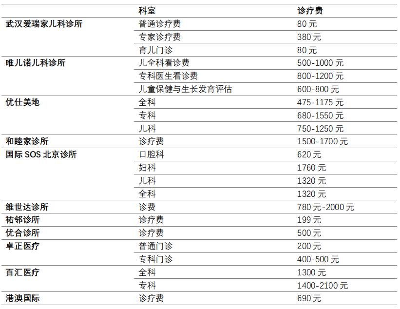 表3-2部分城市中高端诊所诊费价格