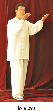 接上式,腰微下沉,蹬出的右脚随腰下沉落地,脚跟先着地, 重心仍在左腿上。腰上提,重心随即前移,右脚踏实,外开的两臂随之向内并拢,手心朝上,相距略小于肩;腰向后拱,呈后倚式, 重心移落左腿上。两臂随腰后拱下倚之势,向下收回至两胯外侧旁, 掌心仍向上,后腿弯曲;腰上提,重心仍在左腿不变,两臂随腰上提之势,两手继续向后划圆弧,由胯两侧腰后向上至两手手心摸到后腰止,左腿随腰上提稍微直立。腰向后下松沉,左腿随之还原呈弯曲状后倚,两手随之抚摸后腰向下至臀部;腰上提走弧形,两手随向前变松拳,随前臂内旋,向前上方划圆,重心移落右腿,呈右弓步,用两拳灌击对方双耳处,眼神向前平视(见图6-290至6-292)。