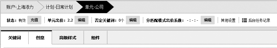 单元的参数比较简单,单元出价是指可以对整个单元里的关键词设定统一的价格,否定关键词项只针对本单元有效,分匹配模式出价系数由于与关键词匹配模式有关,我们在下节中详细讲解。单元的“其他设置”只能修改单元名称。大家可能会注意到,账户、计划和单元都有元个“后台任务记录”功能,我从来没有用过,百度也没有相应的文字介绍。问了百度的客服人员,他说自己也没有用过,只是系统在处理大批量关键词时在此会显示批处理过程。所以,读者可不用理会。