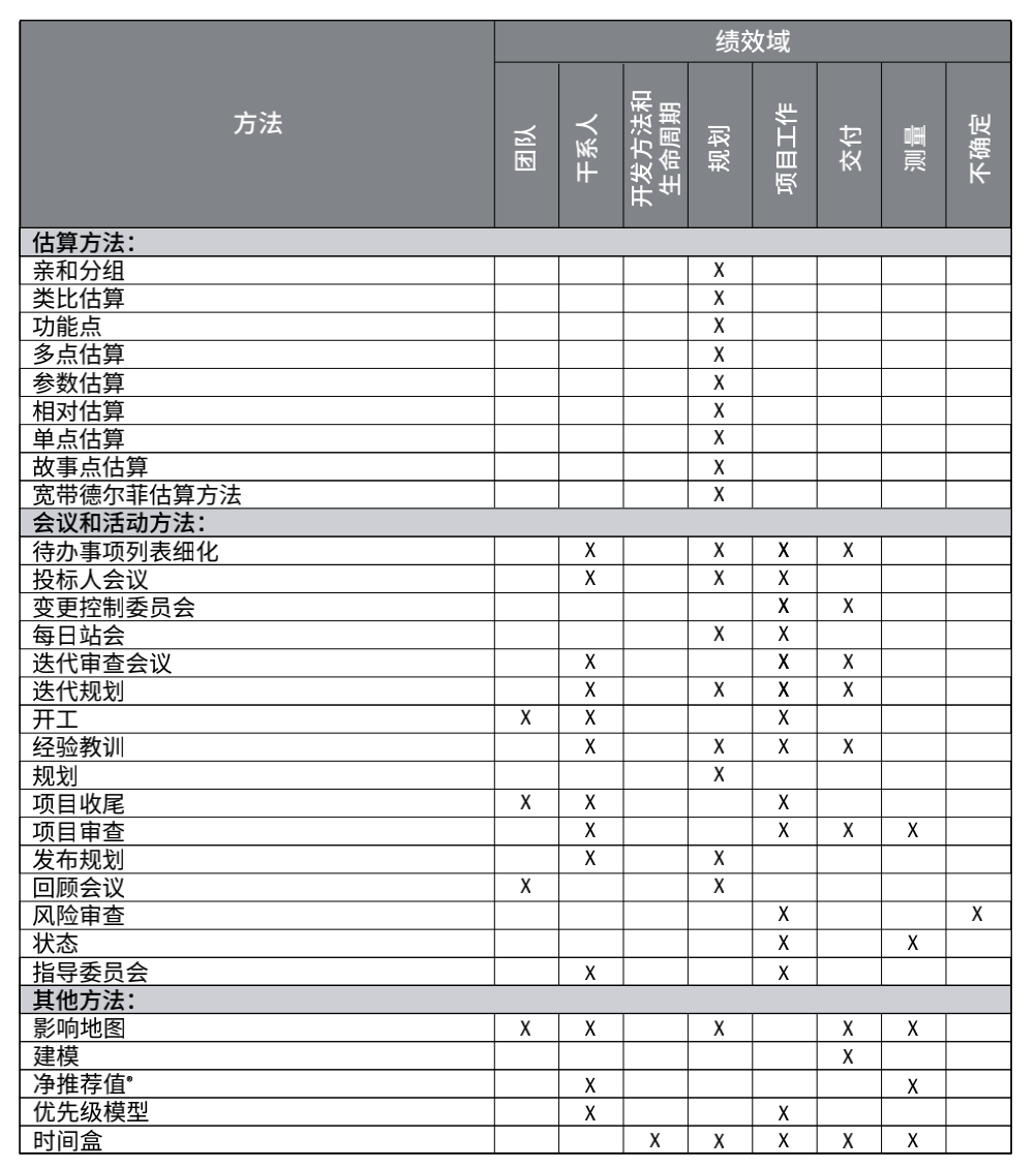 在每个绩效域中,不同的方法可能更有用。虽然交付方法、产品和组织环境的需求将决定哪些方法最适合特定项目,但某些绩效域更有可能使用特定方法。表7-4列出了每种方法最有可能使用的绩效域,但项目经理和/或项目团队负有为其项目选择合适方法的最终责任。表7-4 每种方法最有可能使用的绩效域(图表来自PMBOK第七版)