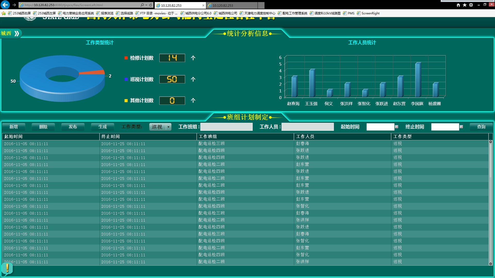 班组人员可在系统中根据检修计划、差异化运维中的巡视周期以及其他日常工作编制班组计划,并用柱状图和饼状图等形式统计了工作类型、检修计划、工作人员等三个方面的信息,以便进行查看分析和总结考核。