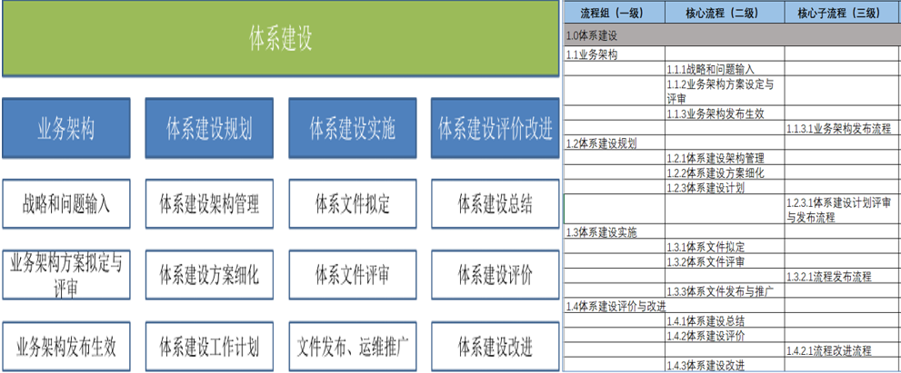 结合其他管理要素,主要是战略和组织管理的要素,在公司集团总部领导的支持下成立了“战略组织体系化建设管理领导小组”,该小组的管理职能包括战略管理、组织管理、体系化建设管理,其中体系化建设管理就包括了制度、流程、标准建设,流程治理体系融入到了体系化建设的管理体系中。