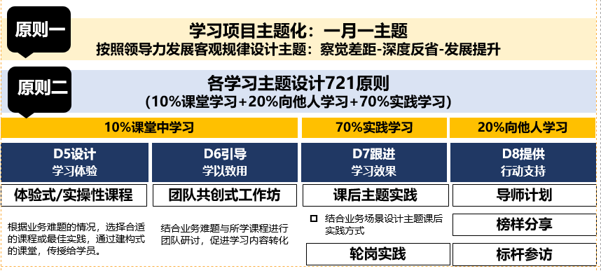 聚焦培训目标后,将结合学习项目设计的主题化原则、721原则匹配不同类型的授课方式,设计精准的课后实践内容、训战结合,弥补能力短板的同时提升岗位绩效。