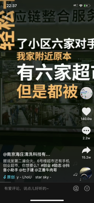 笔者有一个抖音视频,分享的是笔者家楼下小区超市的营销案例,点赞量只有6485人,而一个南京的公司人员转发了这个视频,点赞量竟然突破141万。这个账号原先粉丝只有不到一万人,结果一晚上粉丝增加了25.9万。这就是原创不火的经典案例(图2-17),对方只是把背景换了一下,声音和内容全是笔者的,竟然“也算原创”了。所以,对于抖音的原创,大家要有更直观的认识。别怕模仿和复制,关键是要有创新元素。