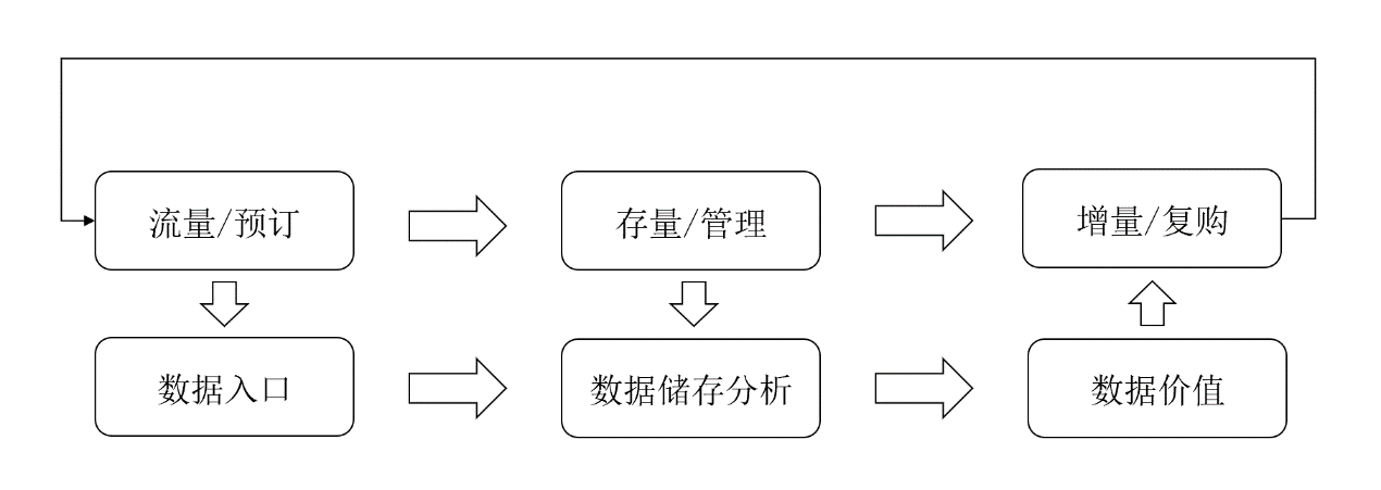 完整的酒店会员系统价值实现路径分为三个阶段,分别是流量/移动预订、存量/会员管理、增量/复购率。会员系统的运行也是按照这个路径逐步递进的。