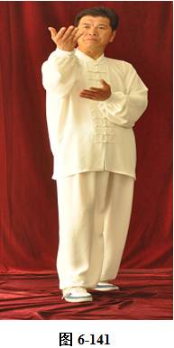 接上式,腰微含,身体重心移至左腿,呈微蹲式。同时两臂翻转下採,眼神下视,接着腰上提,左、右手上翻与右脚同时上提, 右脚向前上步,右脚掌前掌点地,左腿直立,重心仍在左腿上。左手在右肘旁护胸,掌心斜对右肘弯,右手掌心朝上,右手在前,左手在后,两手前后呼应(见图6-139至6-141)。