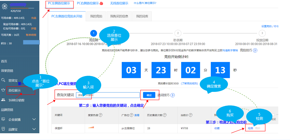 PC左侧首位核心价值:1688主搜左侧第一位,买家关注度高,点击率高。适合场景:近期打造爆品和品牌的商家,快速提升产品曝光,吸引更多优质买家。