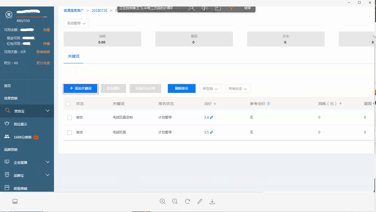 计划建好了之后,下一步添加关键词,这里也有很多技巧,我们将一步一步展示细节。如图10-24所示。