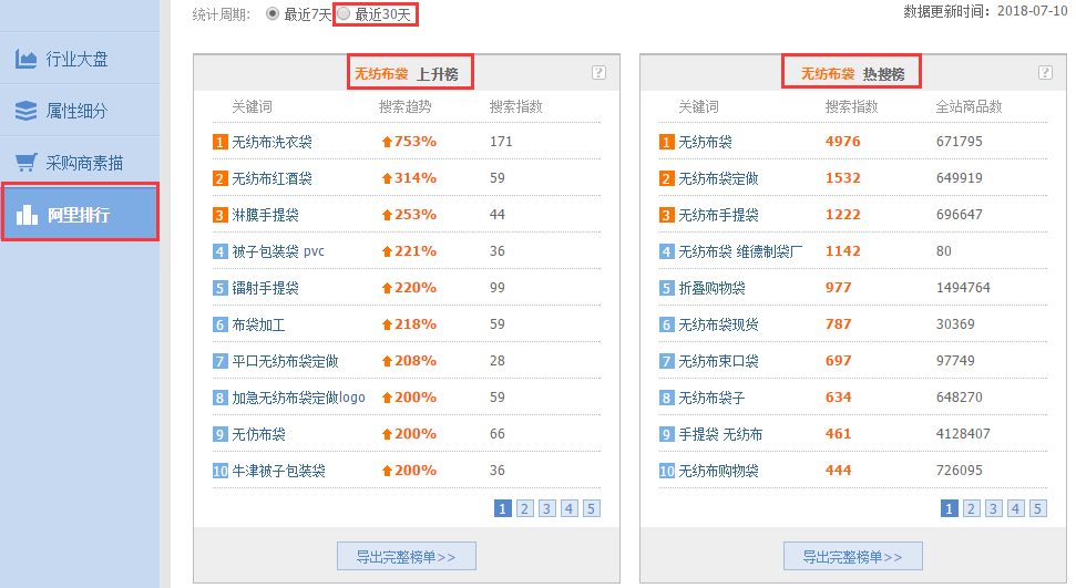 4)参考同行标题关键词的同时,还应该关注阿里指数的阿里排行中的上升榜、热搜榜、转化率榜。这里要说明一下,取词时要注意:看上升榜,选词时一定要选搜索趋势高、搜索指数高的词,而且是选最近30天的(可以每天都把榜单倒出来,然后综合一下,取出现最多也就是搜索趋势一直都高,搜索指数一直都大的);热搜榜选择时道理类似,选择关键词应该是搜索指数高,全站商品数少的关键词,这个少是相对的少,同样是选30天榜单倒出来,每天倒然后综合起来选出现最多、搜索指数高、全站商品数少的。如图4-4、4-5所示。