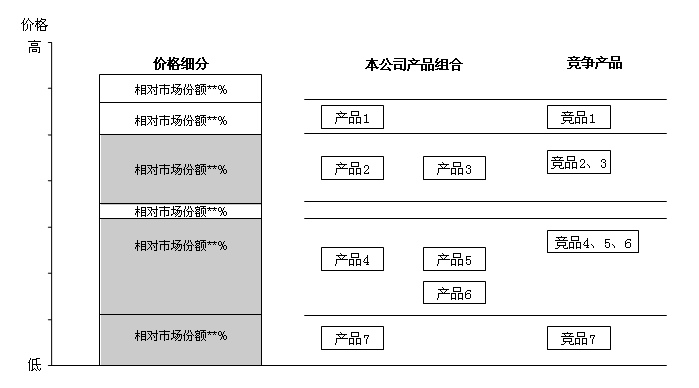 图2-26是价格带战略的基本模型:是以不同价格带区间里的市场规模为标杆,研究本公司及竞品的产品种类、市场份额的结构特点,制定产品组合、营销策略的方法。