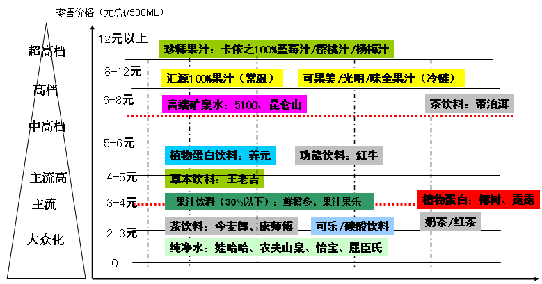 饮料市场的消费结构也是一个正金字塔结构,即随着产品价格的升高,市场规模逐渐变小。在从大众化到超高端的饮料价格带上,不仅是品牌的区分,也是产品品类的区分,总的规律是天然、稀缺、营养的饮料品类处于价格带的高端。