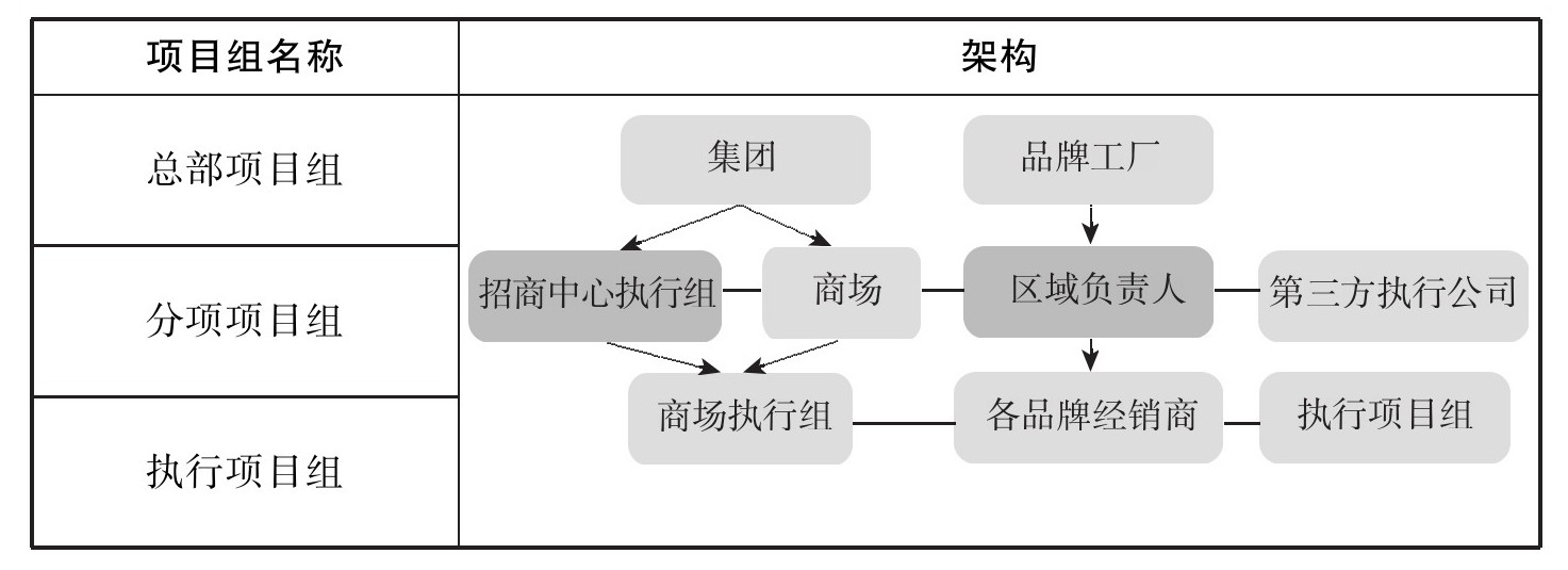 ②分项项目组:总部、商场、第三方执行公司、品牌区域负责人形成项目组,共同管理品牌经销商落地执行;