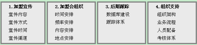 针对上面的两类人群,要想成功唤醒他们加盟的渴望,必须对整个加盟招商体系角度进行完善,如加盟宣传、加盟会组织、后期跟踪、组织支持等,哪个环节出了问题,都可能导致加盟失败。