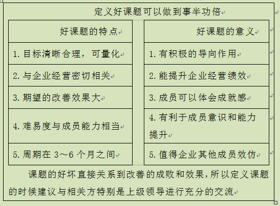 与其选择一些看似很重要但问题模糊不清的课题,倒不如选择一些较小的但是有紧迫性和实际意义的课题。这样做的好处是显而易见的,后者更能取得有效的改善成果,不仅能很好地服务于企业的经营活动,而且能使参与员工体会改善的成就感。