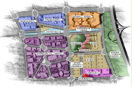 中国(长沙)工程机械交易展示中心新定位的方案由八大功能区组成:①世界品牌企业推广中心;②中国品牌企业运营中心;③国际会展中心;④零配件交易中shopping mall;⑤国际商务中心;⑥综合配套服务中心;⑦工程机械企业人文历史主题公园;⑧室外展场。