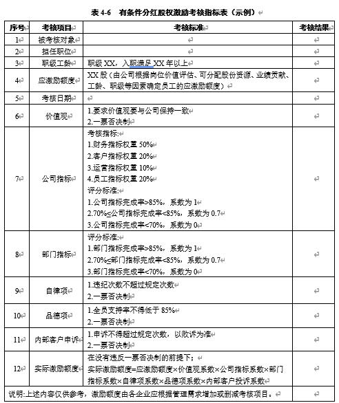 员工的股权激励常用的考核指标包括价值观、公司业绩、部门业绩、自律、品德、客户服务意识等内容,一旦出现指标不达标的情况就可能自动丧失激励资格。