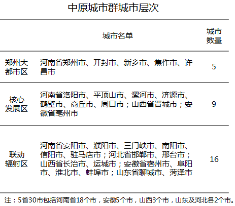中原城市群是以郑州为核心的城市群,由河南、安徽、山西等5省30市组成,包含三个圈层。第一圈层为郑州大都市区,以特大城市郑州为核心,包含5个城市;第二圈层为核心发展区,包含9个城市;第三圈层为联动辐射区,包含16个城市。