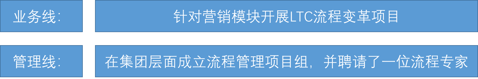 在业务线中,高层特别关注营销模块,希望通过营销模块的流程变革,能有效促进销售额的增长,并规范营销模块的业务流程;基于此目的,高层非常重视营销模块的流程变革,请了国内一家知名的咨询公司来开展这个项目。特别要说明的是,在请咨询公司前,该公司还没有成立任何流程管理相关的组织,也就是说业务流程变革项目走在流程管理体系建设的前面。